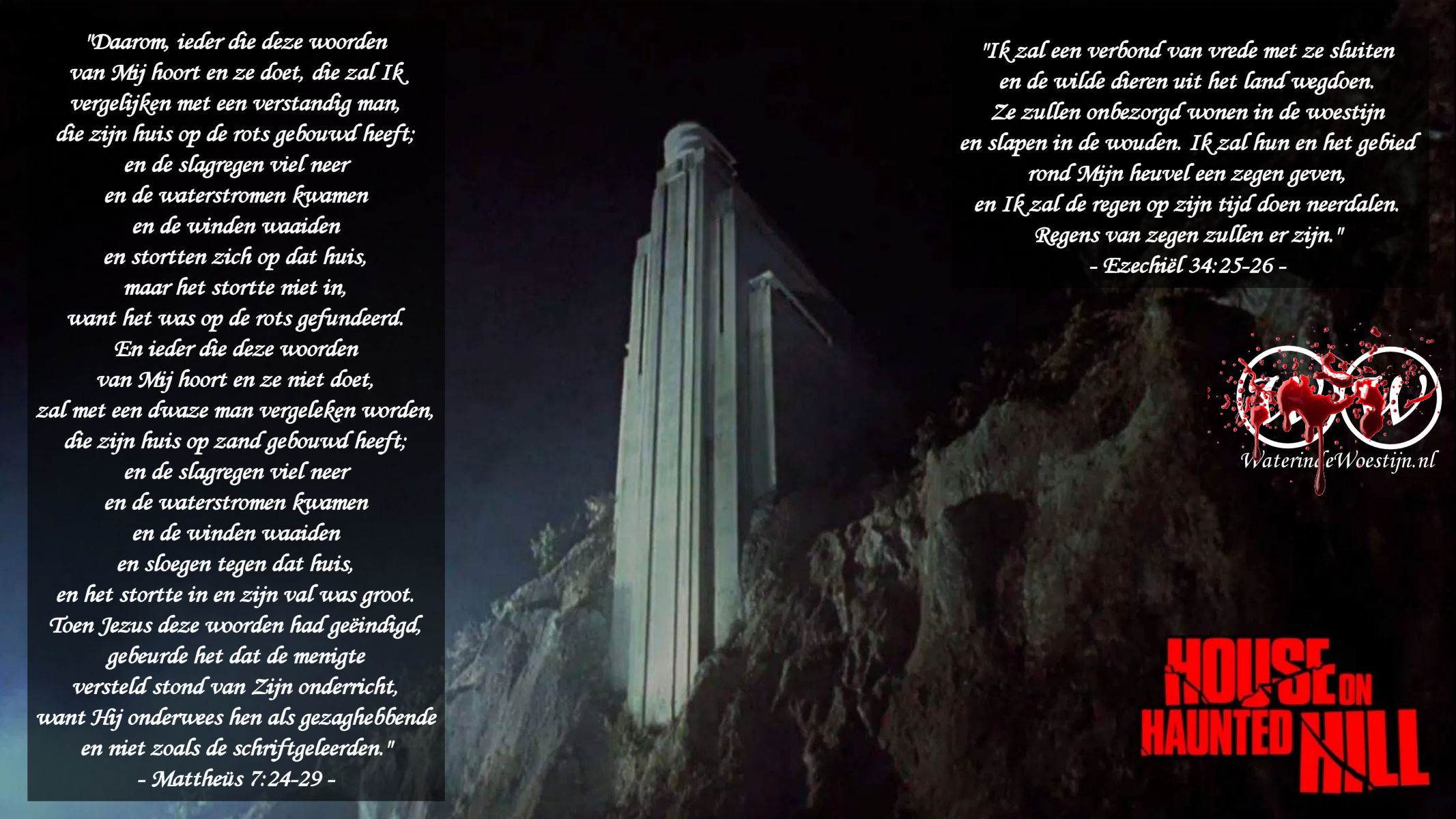 24 “Daarom, ieder die deze woorden van Mij hoort en ze doet, die zal Ik vergelijken met een verstandig man, die zijn huis op de rots gebouwd heeft;
