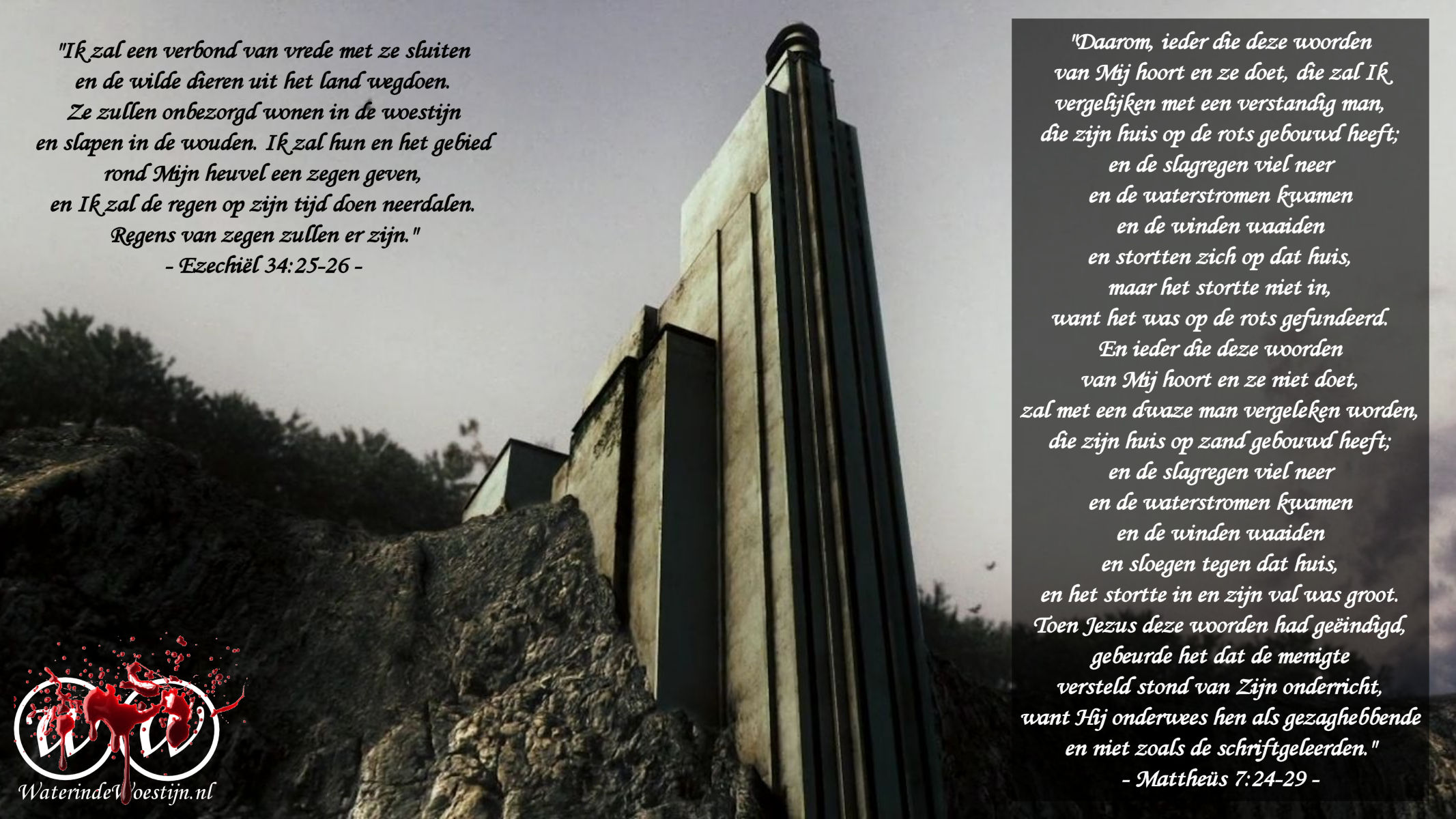24 “Daarom, ieder die deze woorden van Mij hoort en ze doet, die zal Ik vergelijken met een verstandig man, die zijn huis op de rots gebouwd heeft;