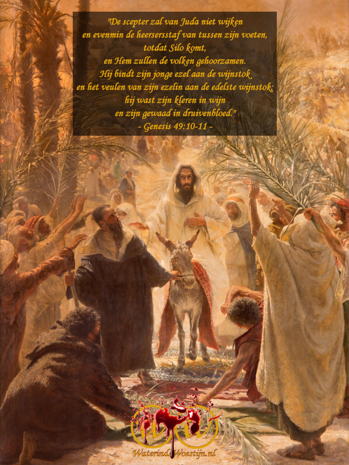 en zijn gewaad in druivenbloed.”